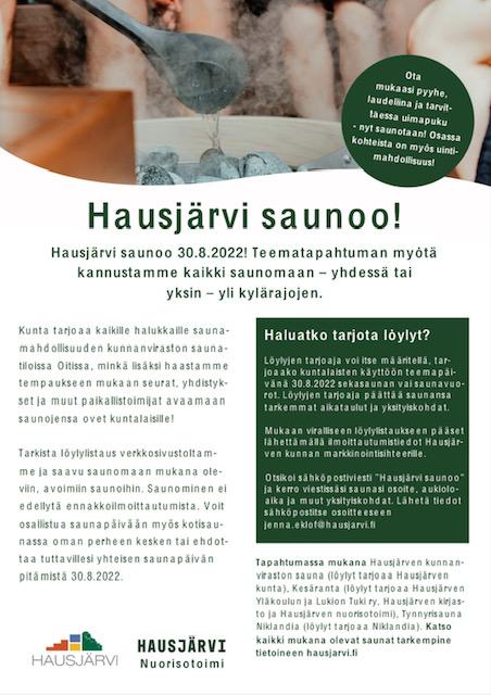 Hiihtoseura mukana Hausjärvi saunoo teematapahtumassa 30.8. Majan sauna lämpiää kaikille 17.00-20.00 välisenä aikana. Saunamajurin toiveesta miehet 17.00-18.30 ja naiset 18.30-20.00 Lisäksi…