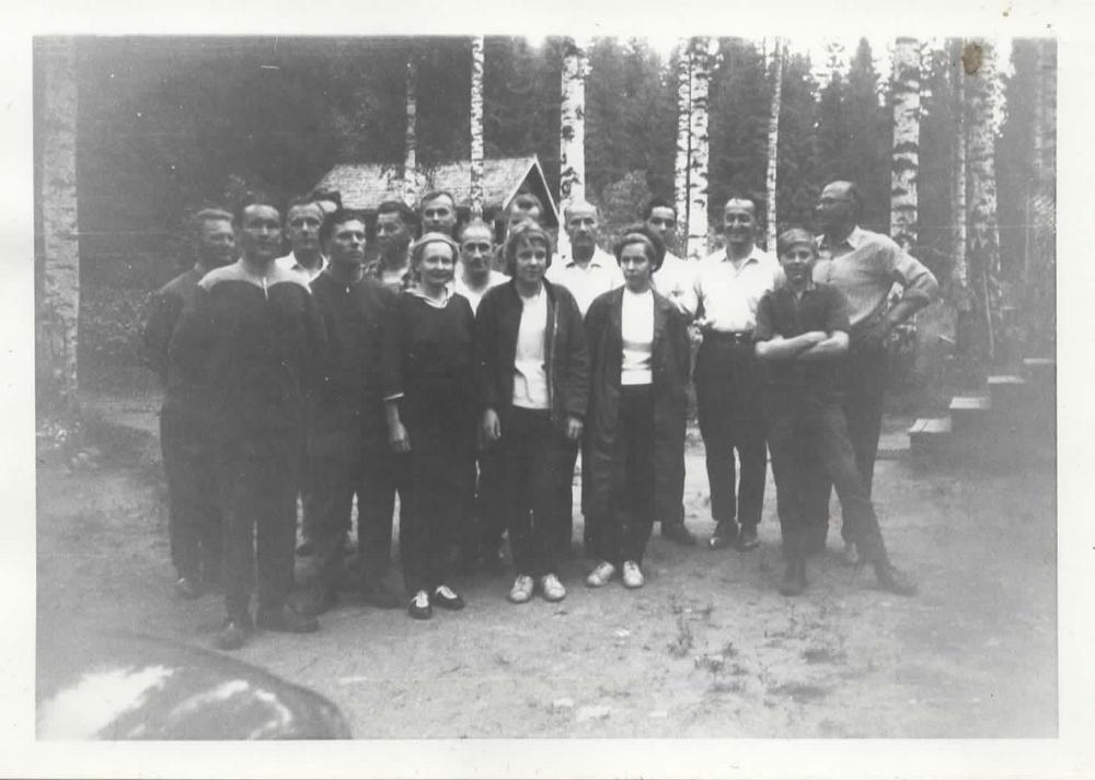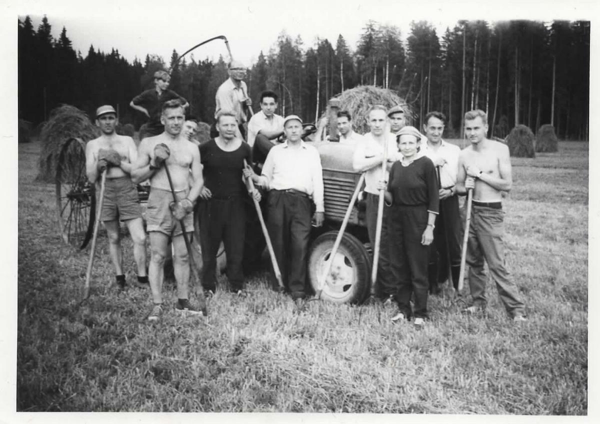 Talkooväkeä Hännisen Sampon pellolla 24.8.1964. Vasemmalta Yrjö Kuki, Antti Norrena, Osmo Varjonen, Voitto Jokinen, Vilho Jaatinen, Vilho Komi, Voitto Mäenpää, Tage Andersson, Veijo Hovi, Tauno Mustonen, Matti Kuisma, Aune Silvennoinen, Kauko Koivuniemi, Timo Kuhmonen.